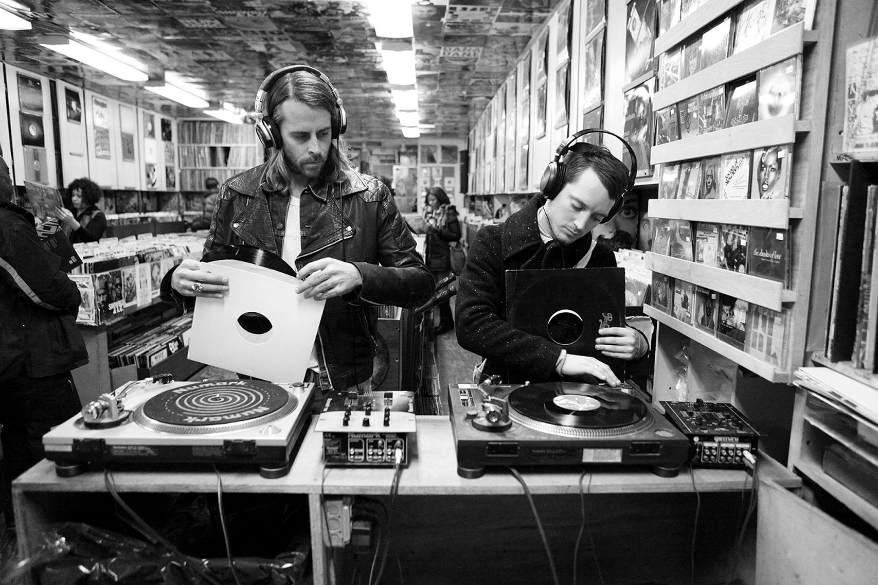 Zack Cowie, left, and Elijah Wood, right, try out vinyl records in A1 Records in New York City on Jan. 19, 2015