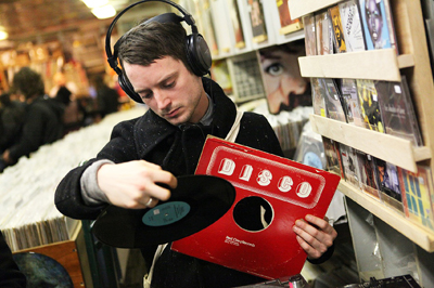 Elijah listening to a vinyl record at A1 Records