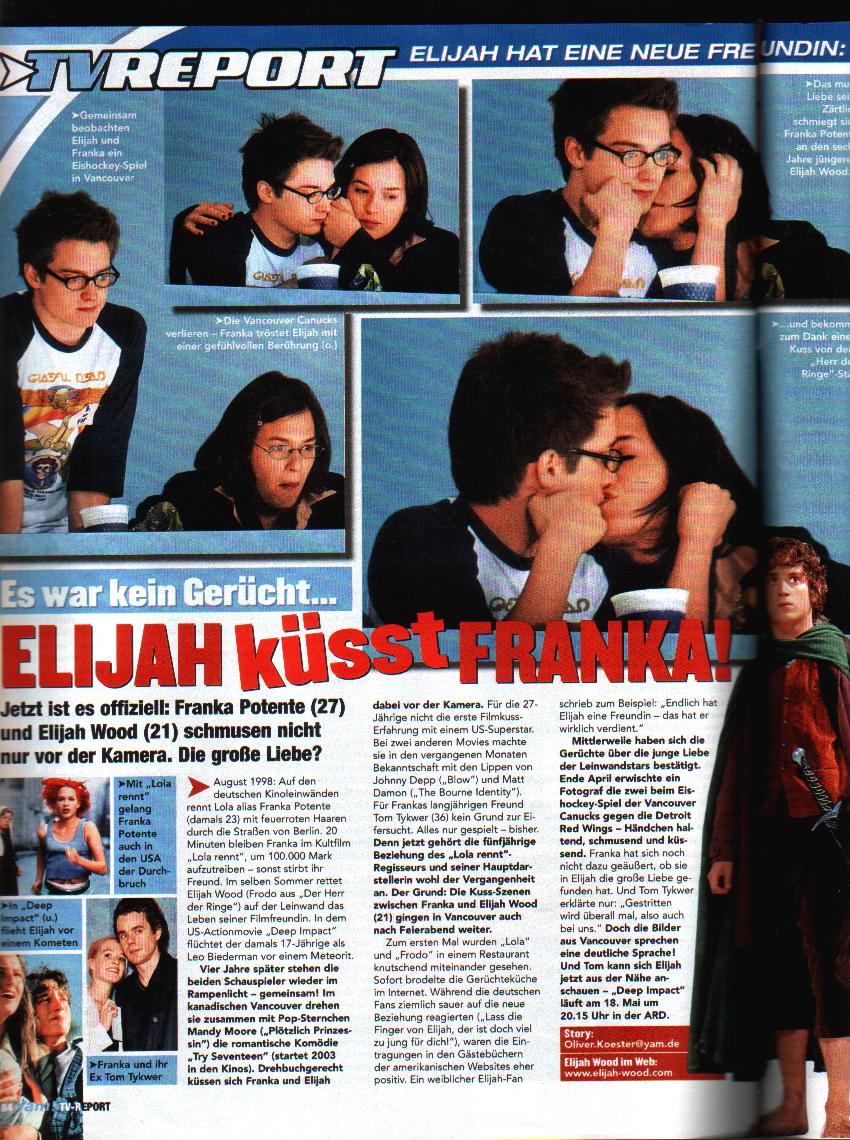- The reason: The kissing-scenes of Franka and Elijah (21) in Vancouver didn't stop after the end of filming. The first time "Lola" and "Frodo" were seen together kissing in a restaurant. Immediately rumours spread all over the internet. While the german fans reacted quite angrily ("Leave your hands off Elijah, he's much too young for you!!"), the signatures in the guestbooks of american websites were more or less positive. One female Elijah-fan e.g. wrote: "Finally Lij has got a girlfriend - he really deserves that." By now the rumours about the young love proved to be true. At the end of April a fotographer caught the two at an icehockey match of the Vancouver Canucks vs. the Detroit Red Wings - holding hands, cuddling and kissing. Franka hasn't yet given her view on the matter of having found the big L in Lij. And Tom Tykwer just explained: "There are arguments everywhere, also in our relationship." But the pics from Vancouver speak an obvious language!